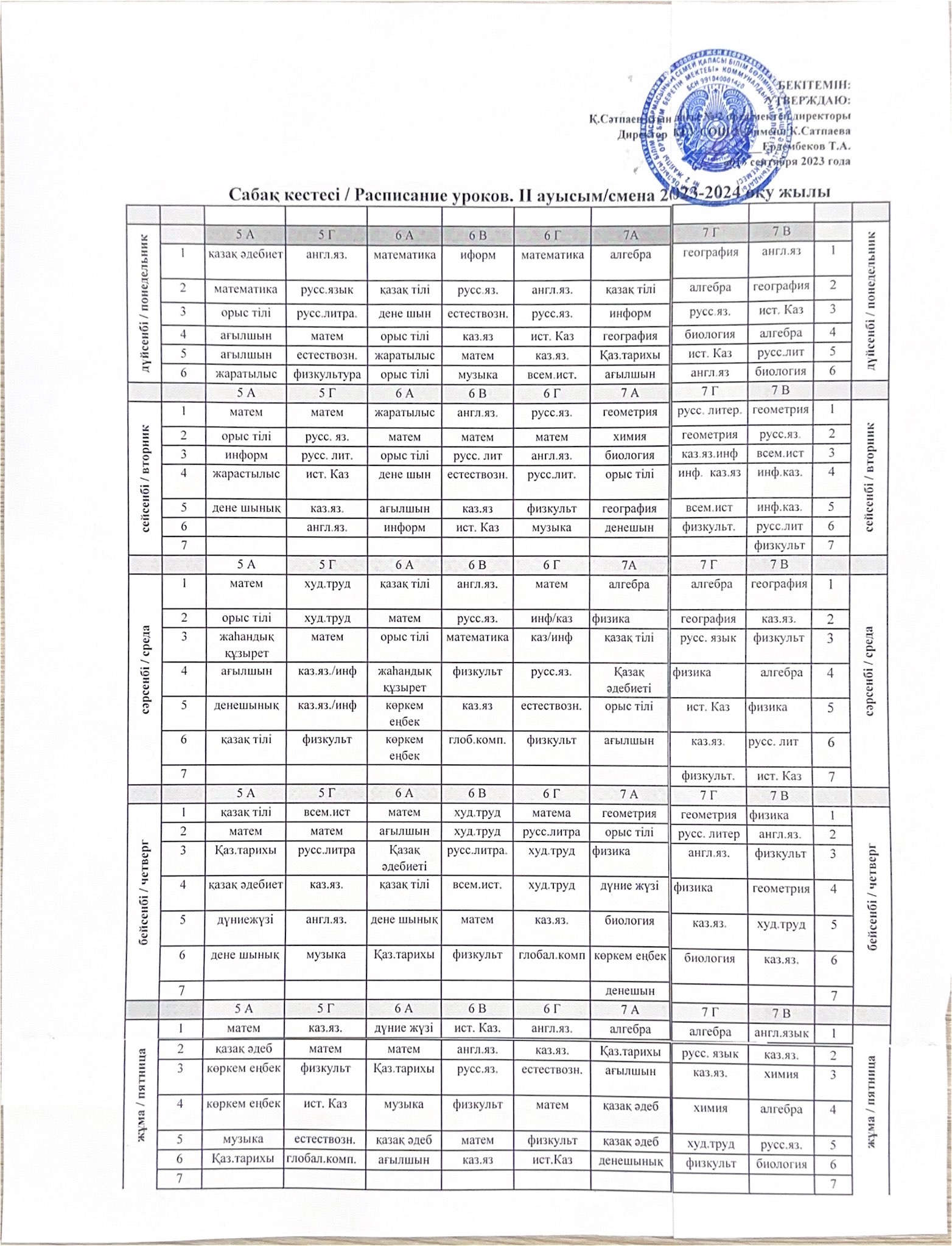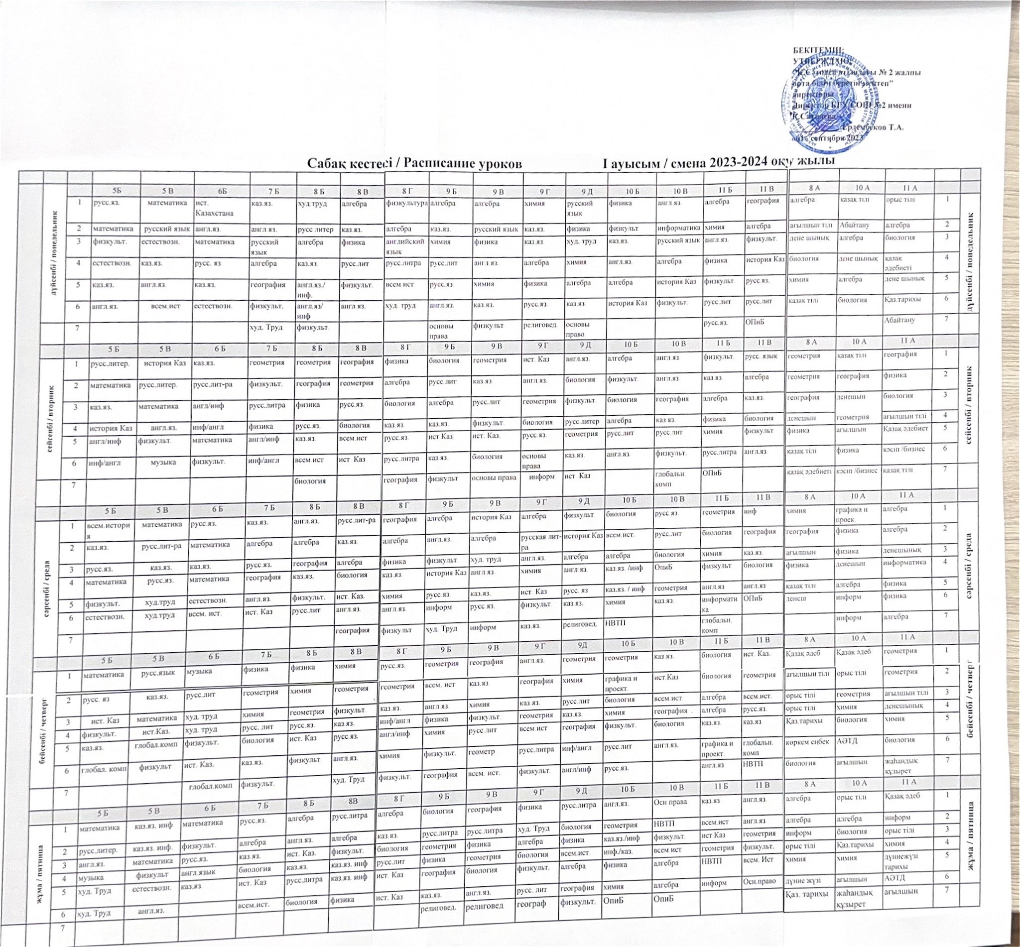 Сабақ кестесі / Расписание уроков / 2023-2024 оқу жылы
